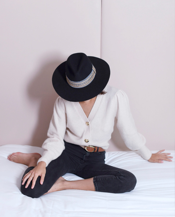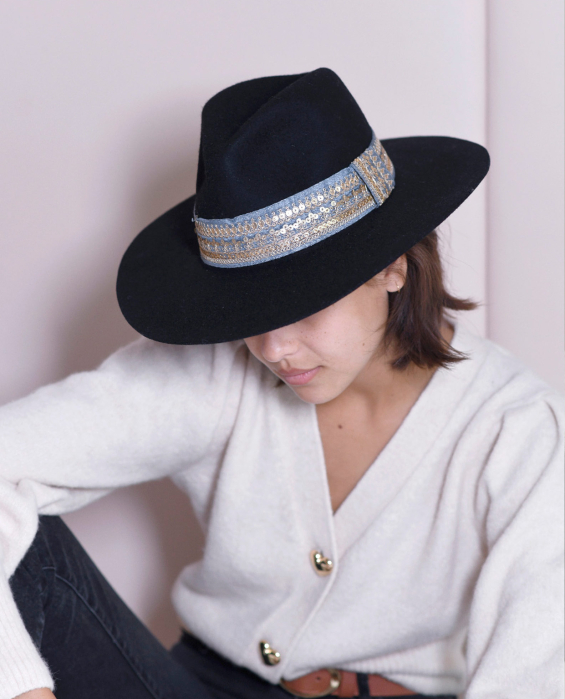A black hat? Much too classic for Maradji! To give a bohemian-chic style to her new women's hat, Delphine went looking for Italian know-how. In 100% wool felt, the Victor Black hat is adorned with a braid embroidered with fine sequins. Thick, this ribbon drapes this hat with a satin grey blue color.