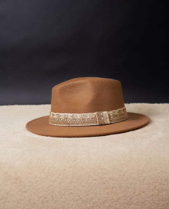 - Wool felt hat decorated with a large camel braid embroidered with gold sequins