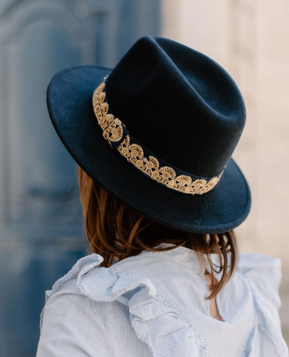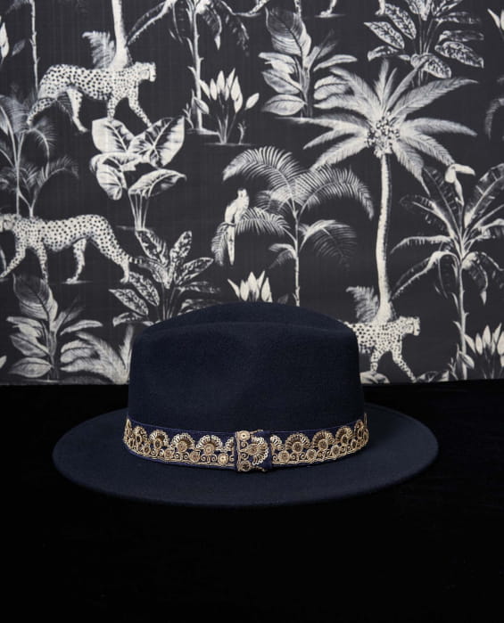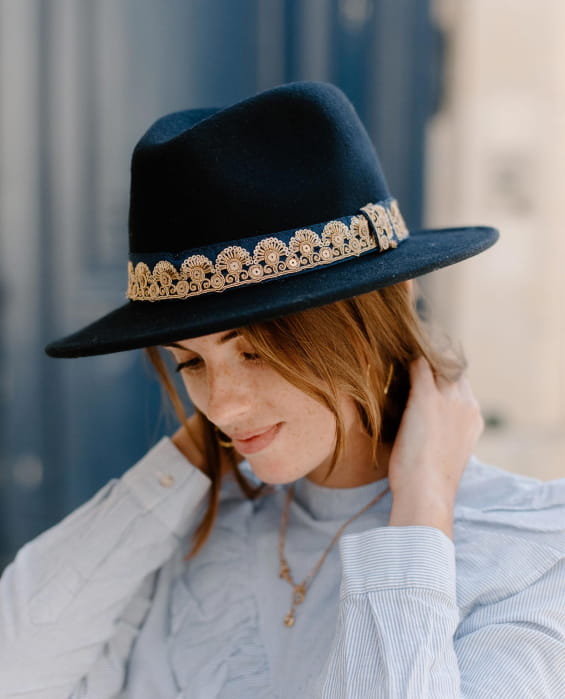 To bring our little Maradji touch, our Jim Navy felt hat is embroidered with fine navy gold-colored braid.