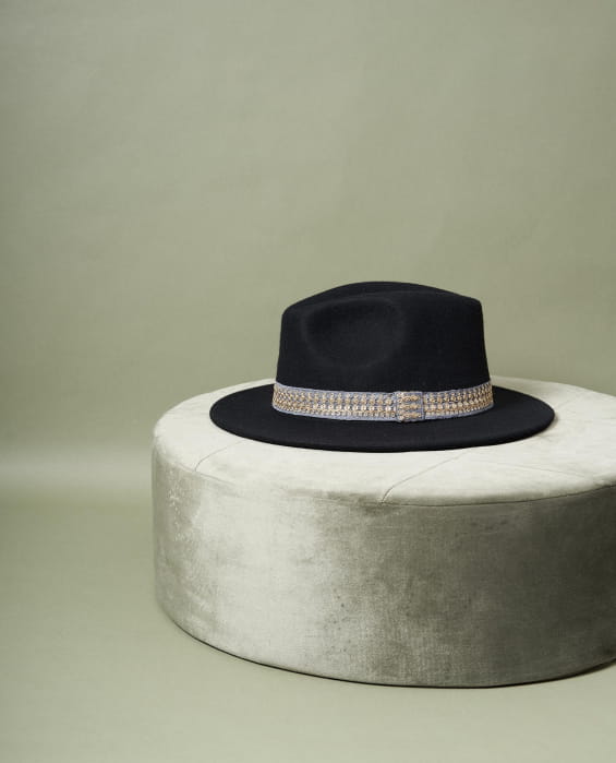 To bring our little Maradji touch, our Jim Black felt hat is embroidered with fine gold sequins on a grey blue-colored braid.