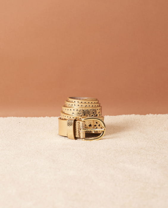 A lovely perforated leather belt, golden, to accessorize your outfits with originality and discretion