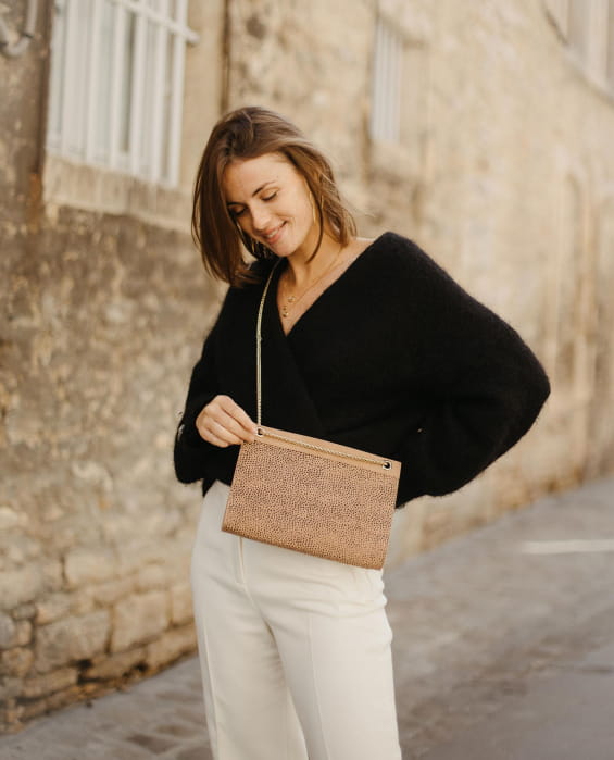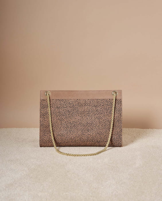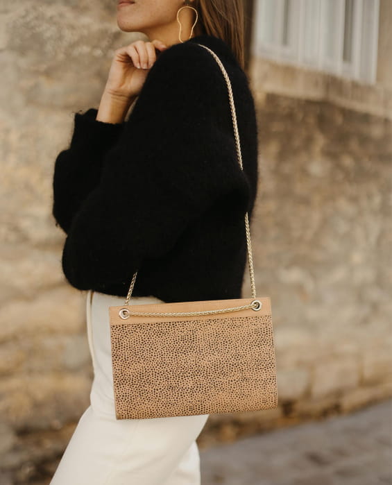 In smooth beige lamb leather with pink polka dots and beige suede goat leather, the Maya Clutch Handbag comes in almost pastel tones, in the shades of an extraordinary desert, just like we imagine at Maradji... With a gold chain handle, the Maya Clutch Handbag has a soft, velvety sheen.