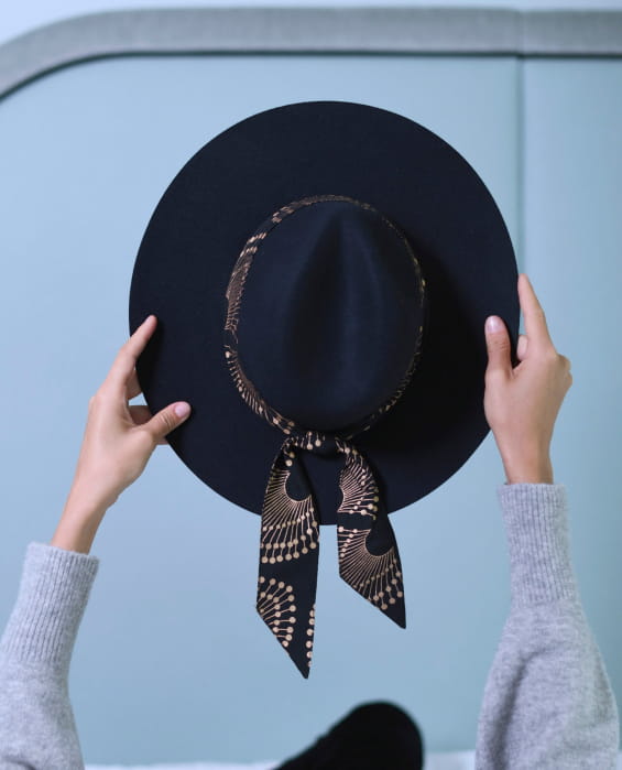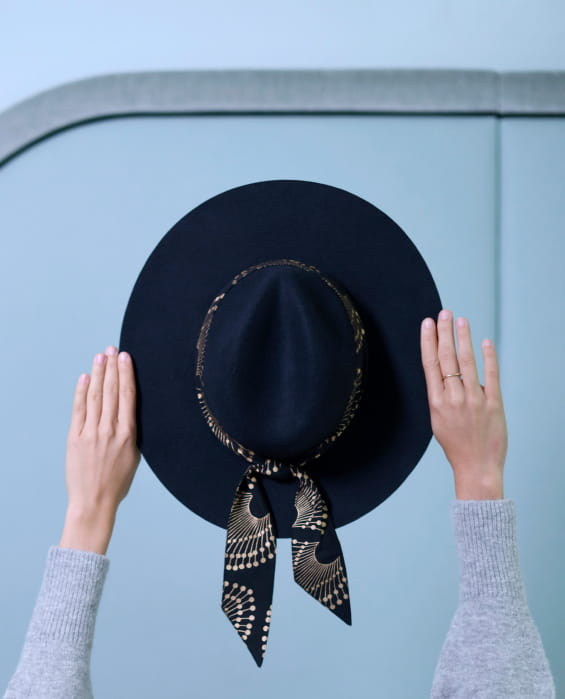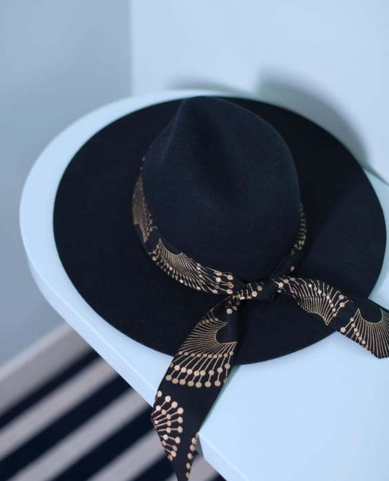 For its new collection of headwear, Maradji makes you travel from Italy to India. Delphine, our designer, wanted this fall to reinvent the classic large felt hat with a Maradji twist: to replace the classic braid, our Sasha Marine hat is decorated with a black scarf screen printed in India with a golden art deco pattern, sewn directly onto the felt.