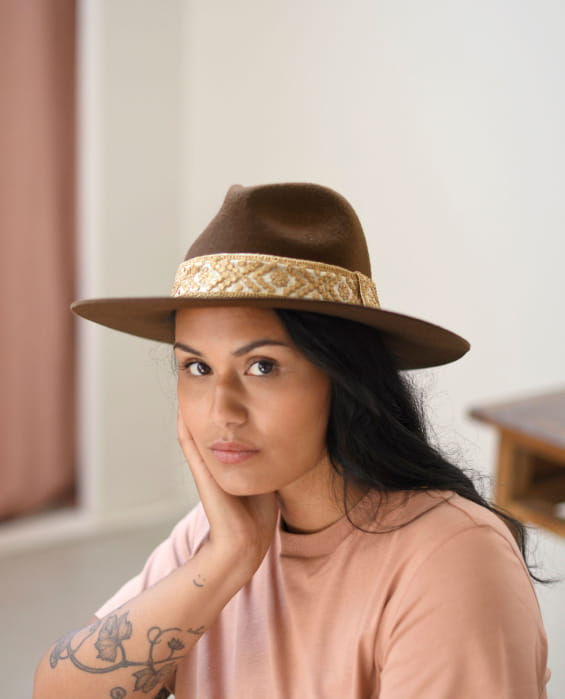 A black hat? Much too classic for Maradji! To give a bohemian-chic style to her winter hat, Delphine has chosen grey heathered felt in 100% wool. The Victor Chocolate hat is also decorated with an embroidered ecru white and golden braid. This satin ribbon, embroidered with a beautiful lurex thread, guarantees a durable felt hat.
